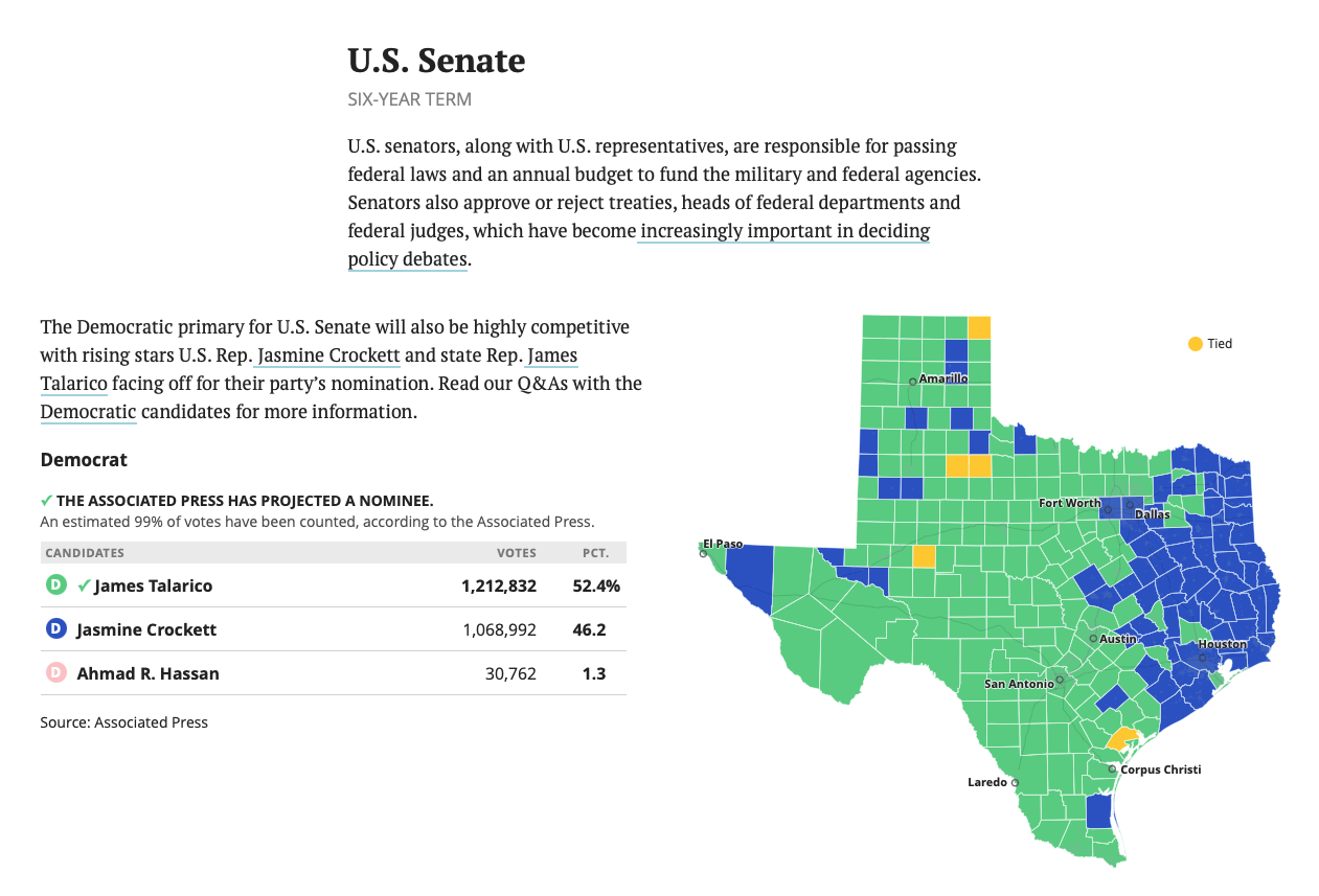 I was contracted by the lovely folks over at the Texas Tribune to manage their election results page for the 2026 Texas primaries. See the final result here.